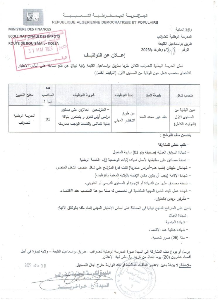 ظهرت المقالة اعلان توظيف بالمدرسة الوطنية للضرائب طريق بوسماعيل القليعة أولاً على المصدر الرسمي للتوظيف الجزائري.