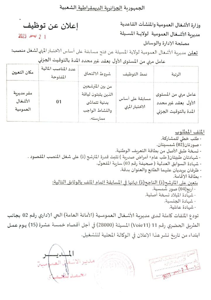 اعلان توظيف بمديرية الأشغال العمومية لولاية المسيلة
