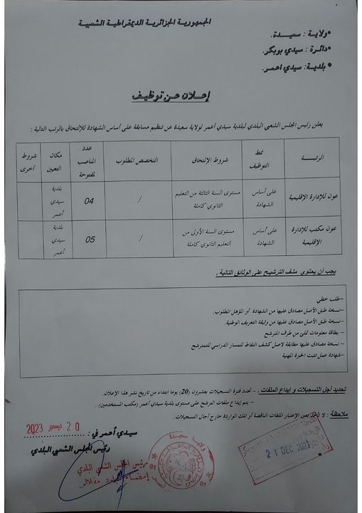 تعلن بلدية سيدي أعمر ولاية سعيدة عن فتح مسابقة توظيف على أساس الشهادة وعلى اساس الاختبار المهني