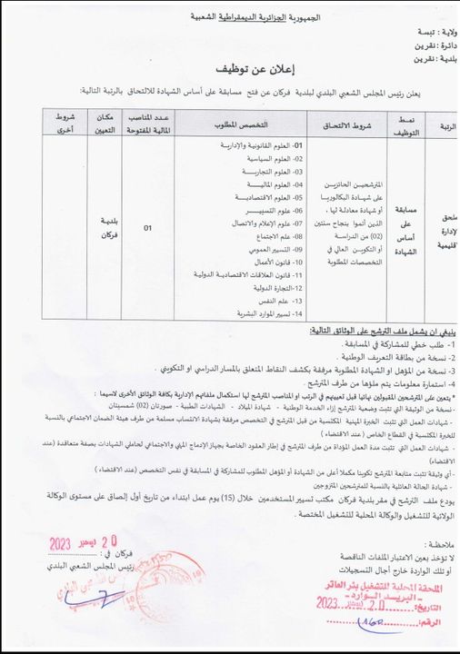 اعلان توظيف ببلدية بئر العاتر وبلدية نقرين ولاية تبسة